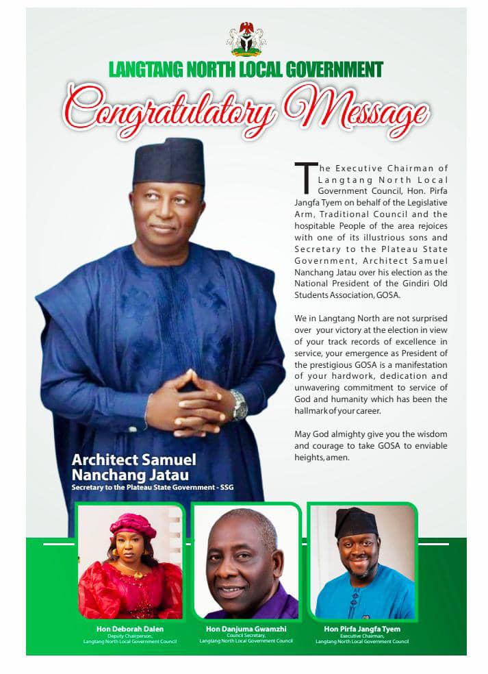 The Executive Chairman of Langtang North Local Government Council, Hon. Pirfa Jangfa Tyem, has congratulated the Secretary to the Plateau State Government, Architect Samuel Nanchang Jatau, over his election as the National President of the Gindiri Old Students Association, over his election as the National President of the Gindiri Old Students Association, GOSA